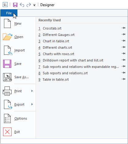 The File menu (The blue tab top left) contains commands for saving, printing, exporting the project and the project options.
