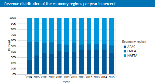 As an example, we will create a chart which shows the currency percentages of the 3 economic areas. Data for APAC, EMEA and NAFTA is supplied as rows.
