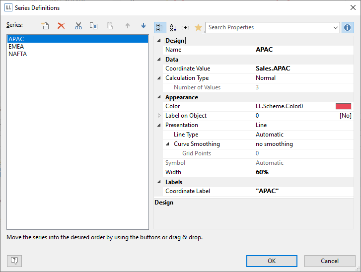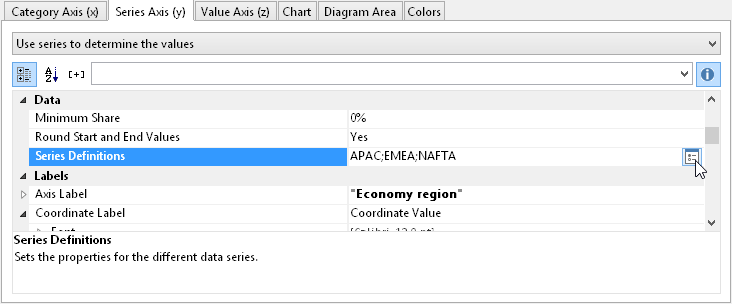 5. This option changes the properties of the series axis and displays a dialog for defining the rows when you click the "Row Definitions" property. Create the individual rows choosing "Sales.APAC", "Sales.EMEA" or "Sales.NAFTA" in each case as the coordinate value.