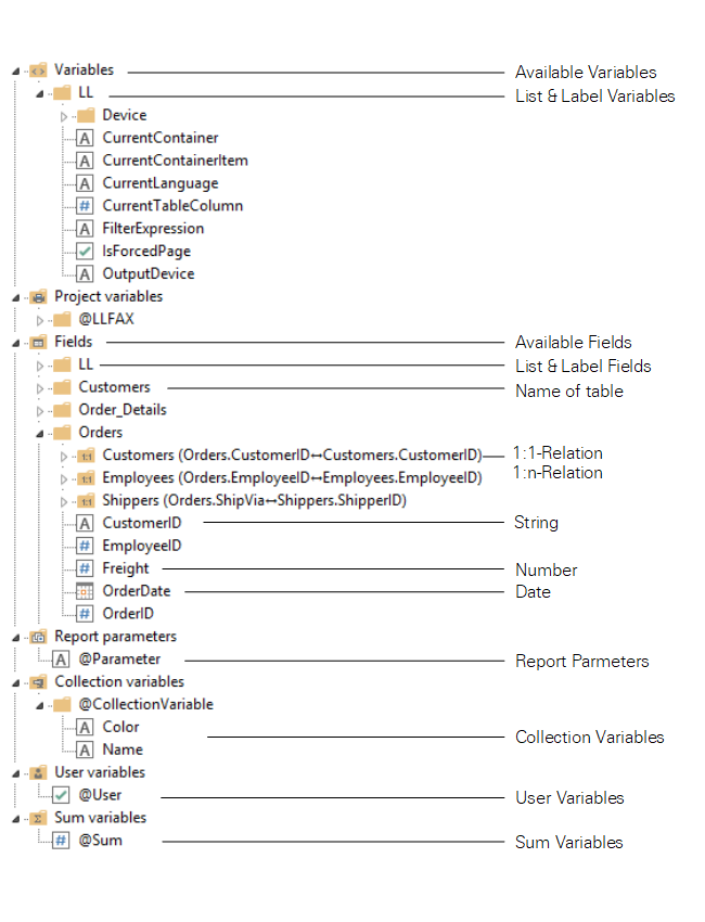 The hierarchical list differentiates between variables, fields, database tables, user variables and sum variables.