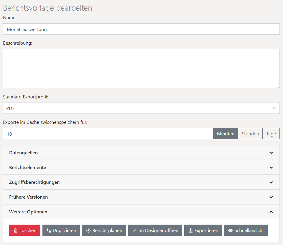 ▪ Exporte im Cache zwischenspeichern für: Geben Sie den Zeitraum an, in dem ein Bericht, bei einem erneuten Aufruf, nicht neu erzeugt wird.