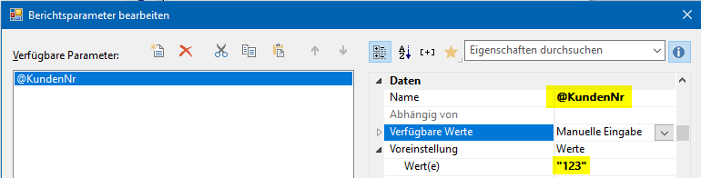 3. Der Designer erkennt die Parameter in den Datenquellen (hier "KundenNr" mit Standardwert 123) und erzeugt automatisch dazu passende Berichtsparameter: