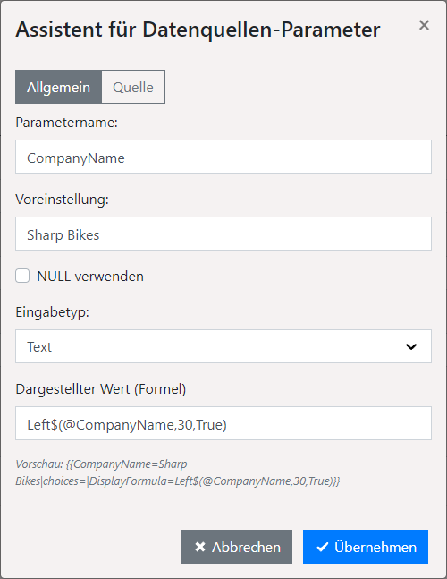 Bei einigen Datenquellen (z. B. JSON, REST, XLS, XML, CSV) können Datenquellen-Parameter in der URL verwendet werden.
