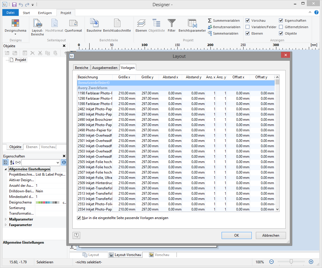 4. Wählen Sie über Projekt > Layout-Bereiche (Projekt > Seitenlayout) ein Etikettenformat aus. Über die Registerkarte "Vorlagen" wählen Sie unter den vordefinierten Etikettenformaten verschiedener Hersteller die gewünschte Vorlage aus. Damit wird automatisch festgelegt, wie groß die einzelnen Etiketten sind und wie viele sich davon wie auf dem Blatt verteilen. Weitere Informationen finden Sie in Kapitel "Vorlagen für Etikettenformate" im Designer-Handbuch.