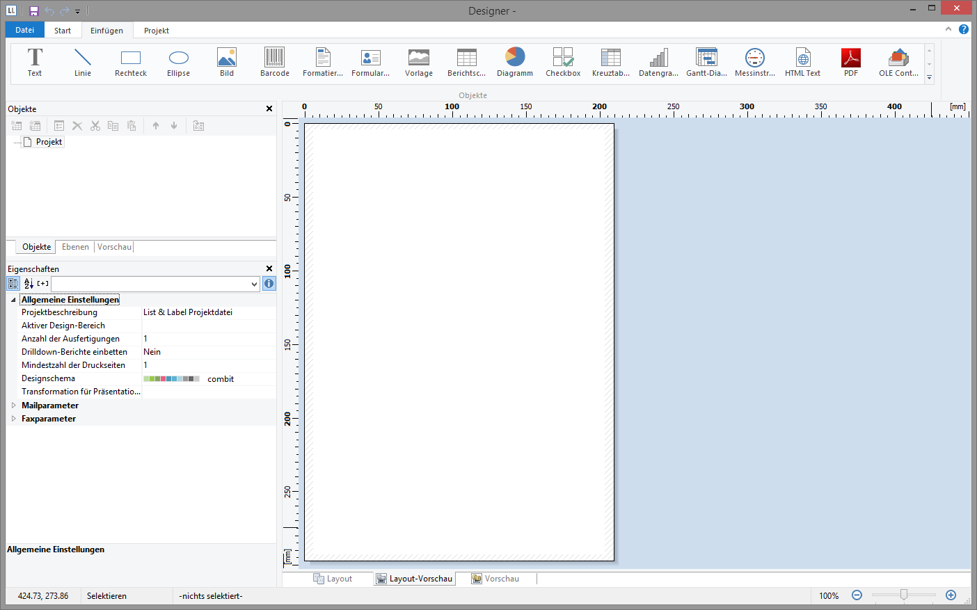 4. Wenn Sie unter Datei > Optionen > Arbeitsbereich (Projekt > Optionen > Arbeitsbereich) "Assistent für Neuanlage" gewählt haben, wird der Projektassistent gestartet. Der Projektassistent erleichtert Ihnen das Anlegen neuer Projekte indem er Sie durch verschiedene Seitenlayout-Optionen führt. Für dieses Beispiel wird kein Assistent verwendet.