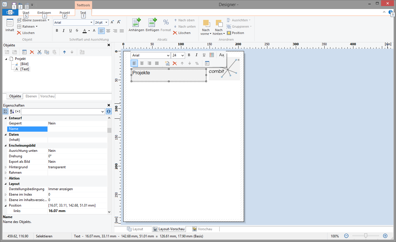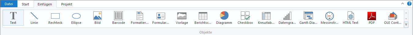 Um einen Titel in den Bericht einzufügen verwenden Sie das Textobjekt. Textobjekte dienen dazu, einen beliebigen Text auf dem Arbeitsbereich zu platzieren. Zusätzlich zu festem Text können hier auch Feldinhalte (Variablen) aus der Datenbank (z. B. Firmenname) oder auch Funktionen (z. B. Datum) eingesetzt werden.