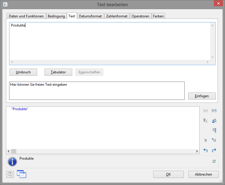 ▪ Text: Zur Eingabe von festem Text und Tabulatoren.