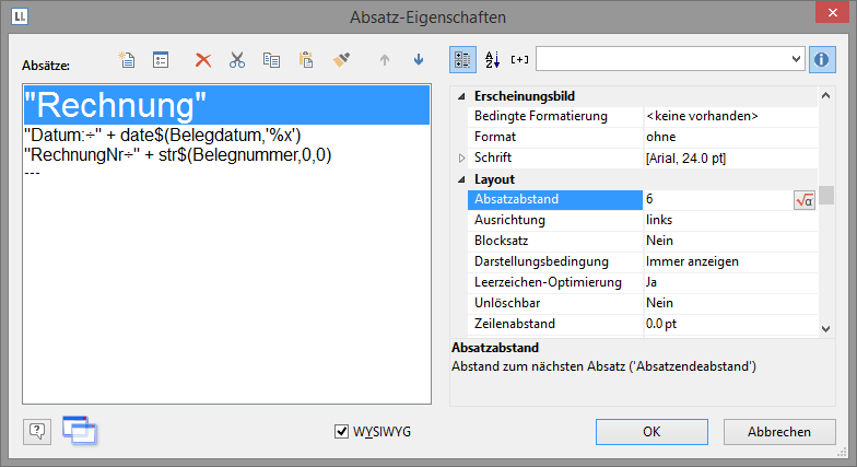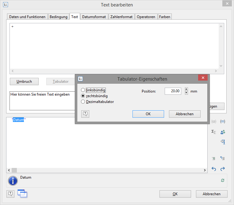 Hinweis: Pro Zeile kann ein Tabulator eingefügt werden. Ein Tabulator bewirkt, dass der Text davor bis max. zum Tabulator läuft. Bei einem rechtsbündigen Tabulator wird der Text nach dem Tabulator rechtsbündig angezeigt. Über die Position des Tabulators wird der Abstand vom linken Rand angegeben.