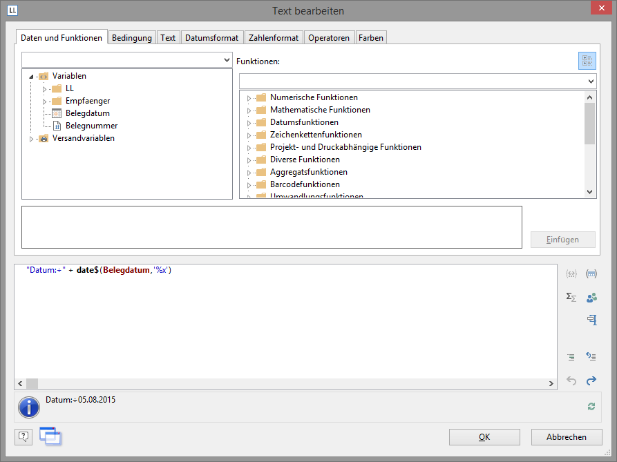 Diese Formatkonvertierung durch die Funktion "Date$()" ist notwendig, da es sich beim Datumsfeld um den Feldtyp "Datum" handelt und der Rückgabewert durch den eingegebenen Text "Datum:" bereits als "Zeichenkette" festgelegt ist. Der Rückgabewert muss stets eindeutig sein, daher muss der Datumswert über eine Funktion in eine Zeichenkette umgewandelt werden. Eine Möglichkeit hierfür ist die Funktion "Date$()".