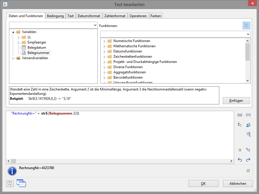 Diese Formatkonvertierung durch die Funktion "Str$()" ist notwendig, da es sich bei der Rechnungsnummer um den Feldtyp "Zahl" handelt und der Rückgabewert durch den eingegebenen Text "Rechnungsnummer:" bereits als "Zeichenkette" festgelegt ist. Der Rückgabewert muss stets eindeutig sein, daher muss die Zahl über eine Funktion in eine Zeichenkette umgewandelt werden. Eine Möglichkeit hierfür ist die Funktion "Str$()". Diese Funktion hat insgesamt 3 Parameter: Der erste Parameter ist die Zahl die in eine Zeichenkette gewandelt werden soll, der zweite Parameter bestimmt die Mindestlänge und der dritte Parameter die Nachkommastellen.