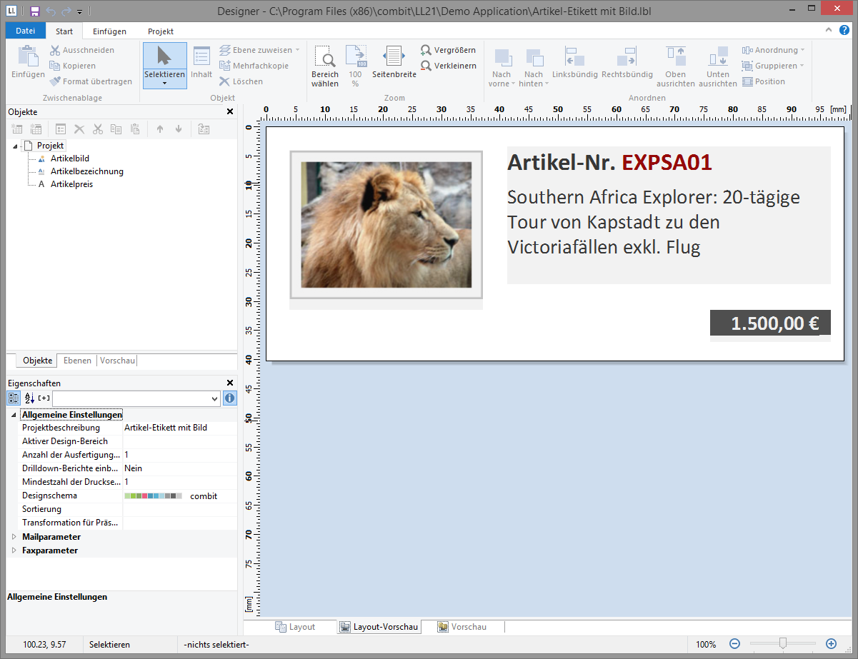 Auf dem Etikett soll ein Bildobjekt (für das Artikelbild), zwei Textobjekte (für Artikel.Nr, Bezeichnungen und Preis) und ein Barcode (mit der Artikel.Nr) dargestellt werden. Zwischen dem Text "Artikel-Nr:" und der Variablen "Artikel.Nr" setzen Sie einen Tabulator.