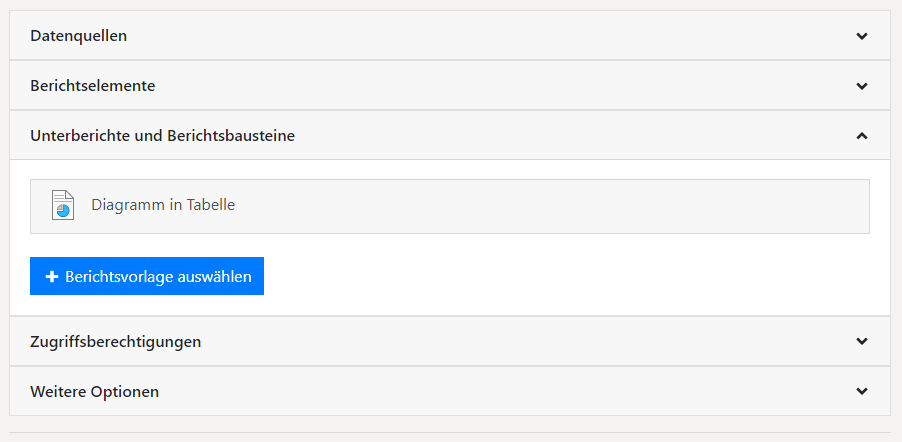 Um einen Unterbericht oder einen Berichtsbaustein hinzufügen, selektieren Sie „Berichtsvorlage auswählen“ und wählen die dementsprechende Berichtsvorlage aus.