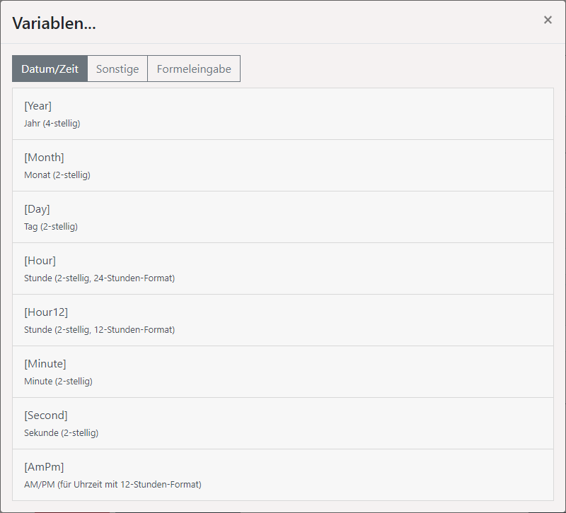 ▪ Datum/Zeit: u. a. [Year] aktuelles Jahr, [Month]/[Day] aktueller Monat/Tag, [Hour]/[Hour12]/[Minute]/[Second] aktuelle Stunde/Minute/Sekunde, [AmPm] AM/PM