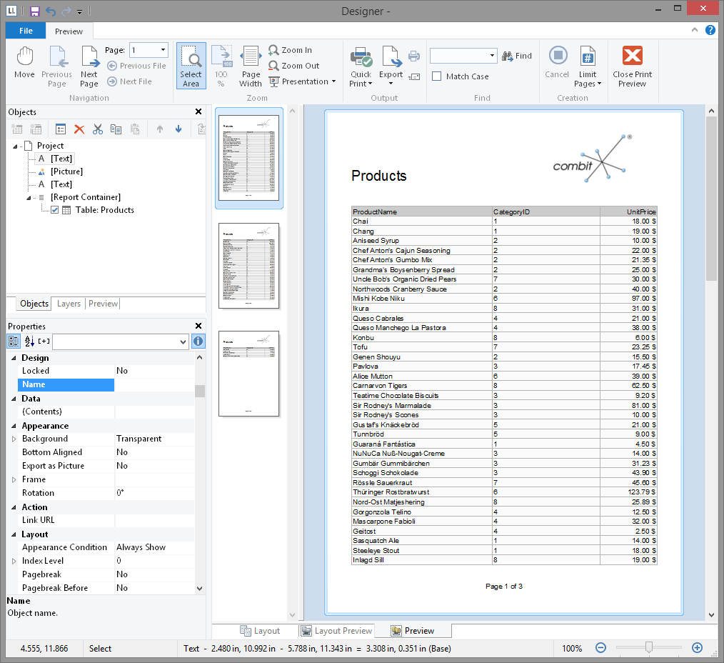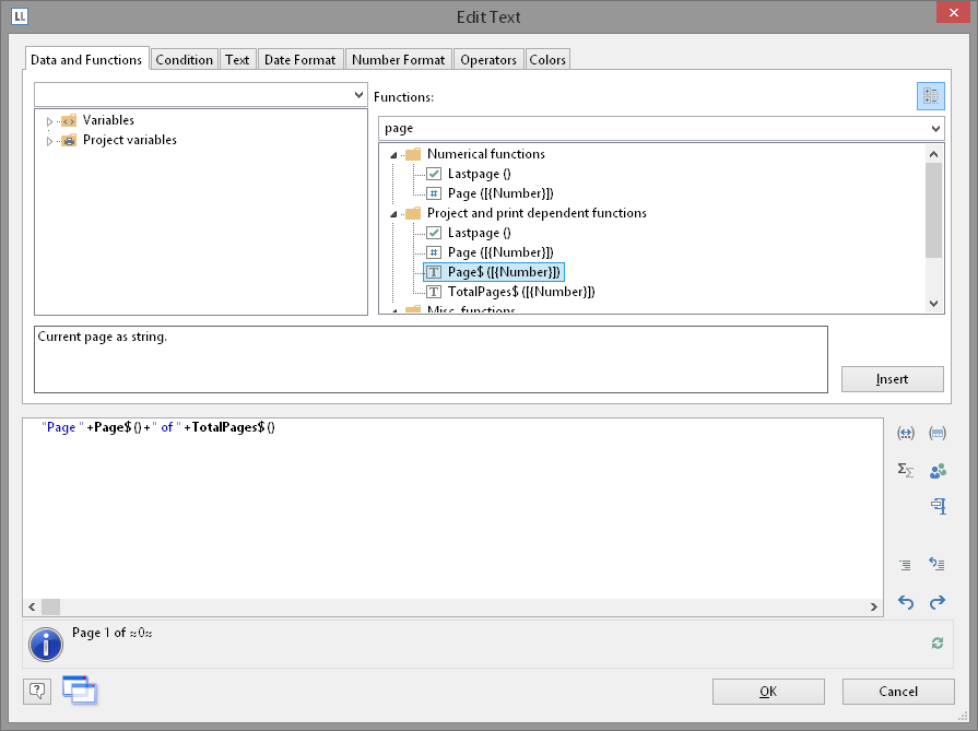 4. If you now want to output a footer in the form of "Page 1 of 2", you can enter the text "of" directly in the usual way. Please consider that individual parts must be joined with a "+" and that text must be enclosed in quotation marks.