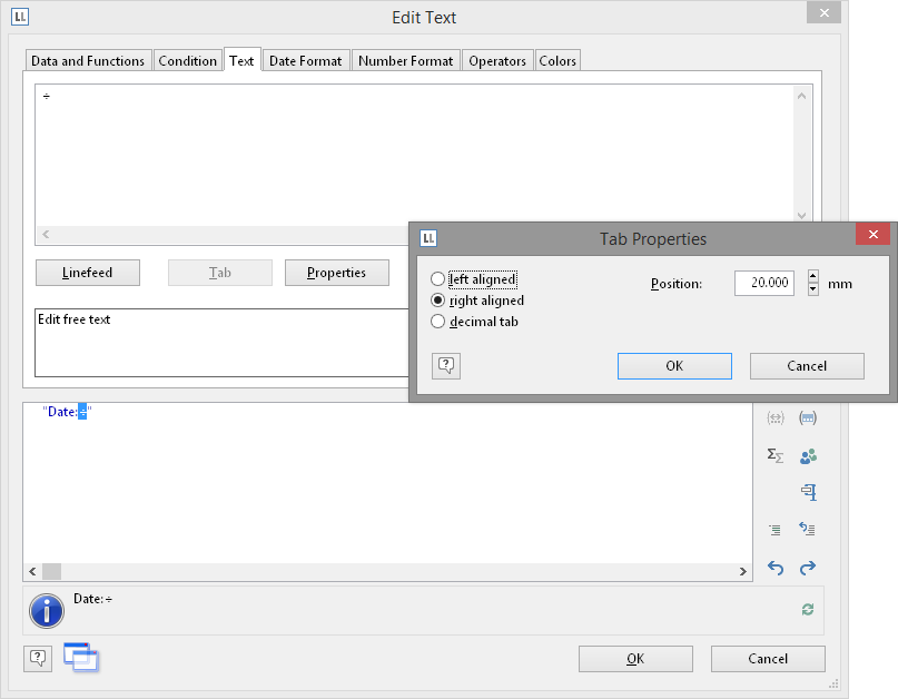 Since a tab stop is also a character, it must also be enclosed in quotation marks. Alternatively, in this example, you can insert the tab stop with "Insert" to the existing "Invoice date" text.