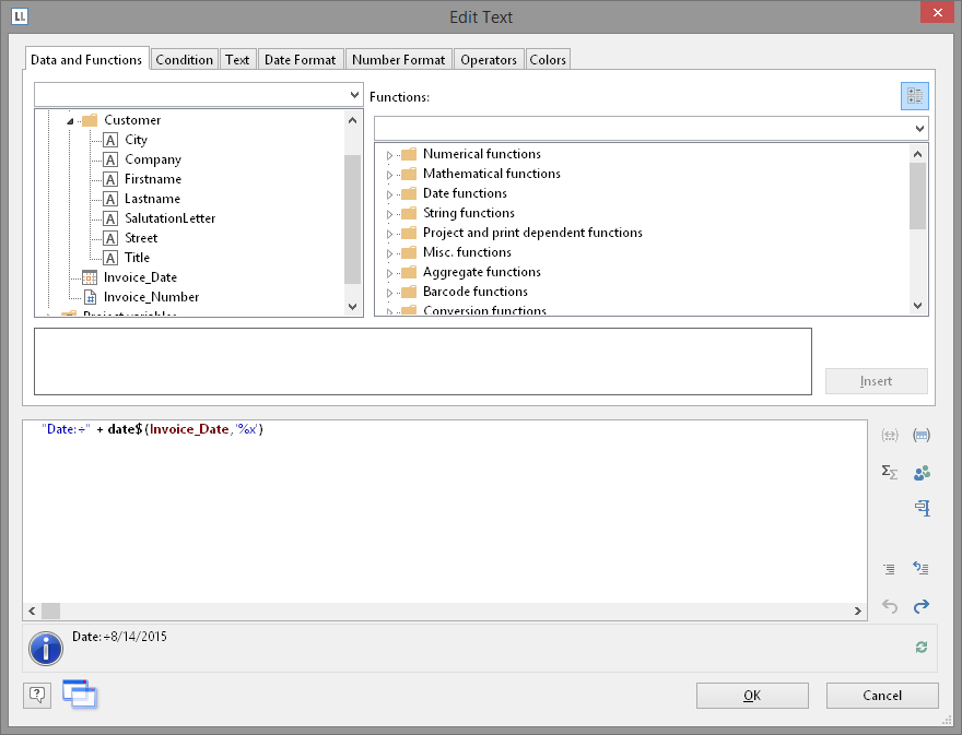 Conversion with the "Date$()" function is essential since the invoice date has the "date" type and the value that is returned is already defined as a "string" by the "Invoice date" text expression entered earlier. The return value must always be unique. The date value must therefore be converted to a string by means of a function. The "Date$()" function is one way of doing this.