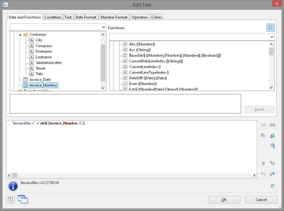 Conversion with the "Str$()" function is essential since the invoice number is a field with the "number" type and the value that is returned is already defined as a "string" by the "Invoice number" text expression entered earlier. The return value must always be unique. The number must therefore be converted to a string by means of a function. The "Str$()" function is one way of doing this. This function has 3 parameters: The first parameter is the number that is to be converted to a string; the second parameter specifies the minimum length and the third parameter the number of decimal places.