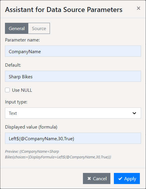 ▪ 'Displayed value (formula)': A formula can be specified if a table or 'Predefined values' is selected for 'Source'. The parameter name is passed as '@parametername'. The specification is optional.