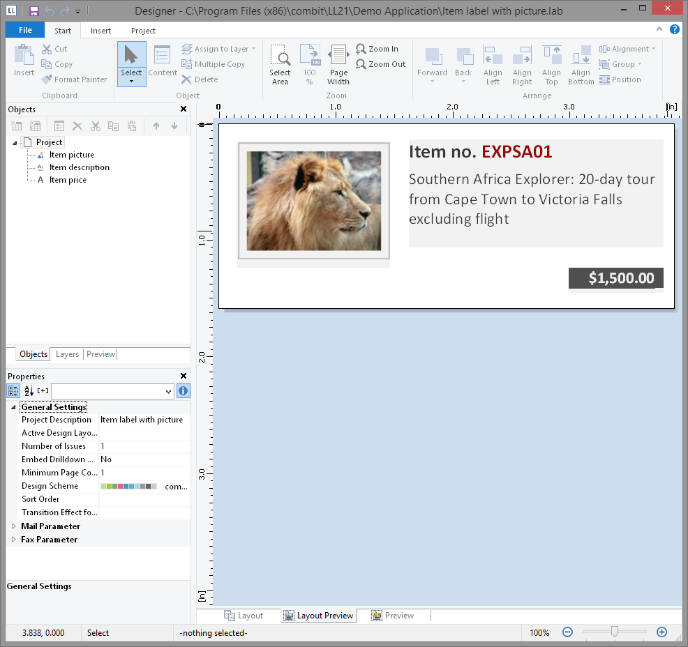 A picture of the item is to be displayed as a picture object on the label together with two text objects (Item_No, Description and Price). Place a tab stop between the text "Item No." and the "Item_No) variable.