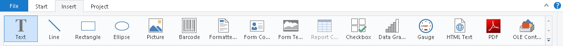 ▪ Tool windows for the available variables and fields (Variables-/Field-List), the objects and elements of the report container, the different display layers (Layers) and the properties of the selected object or project (Properties).