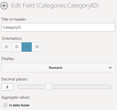 ▪ With numeric columns, you can activate a footer using the "In table footer" option. This calculates the aggregate value for the column as defined in the option box. You can choose from: Average, Count, Maximum, Median, Minimum, Standard Deviation, Sum, Variance.