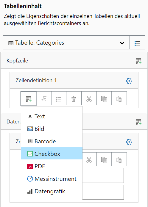 2. In einer Tabellenzelle: Wählen Sie dazu im Tabelleninhalt-Fenster über "Neue Spalte hinzufügen" den Eintrag "Checkbox" aus.