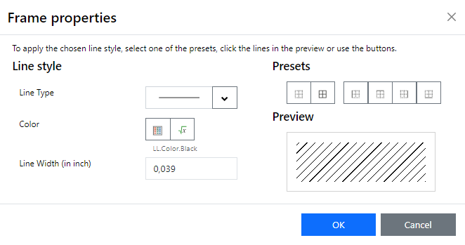You can define frame properties and distances in a dialog. To apply the selected type of line, color or width, click one of the default settings, the lines of the preview or use the buttons. |