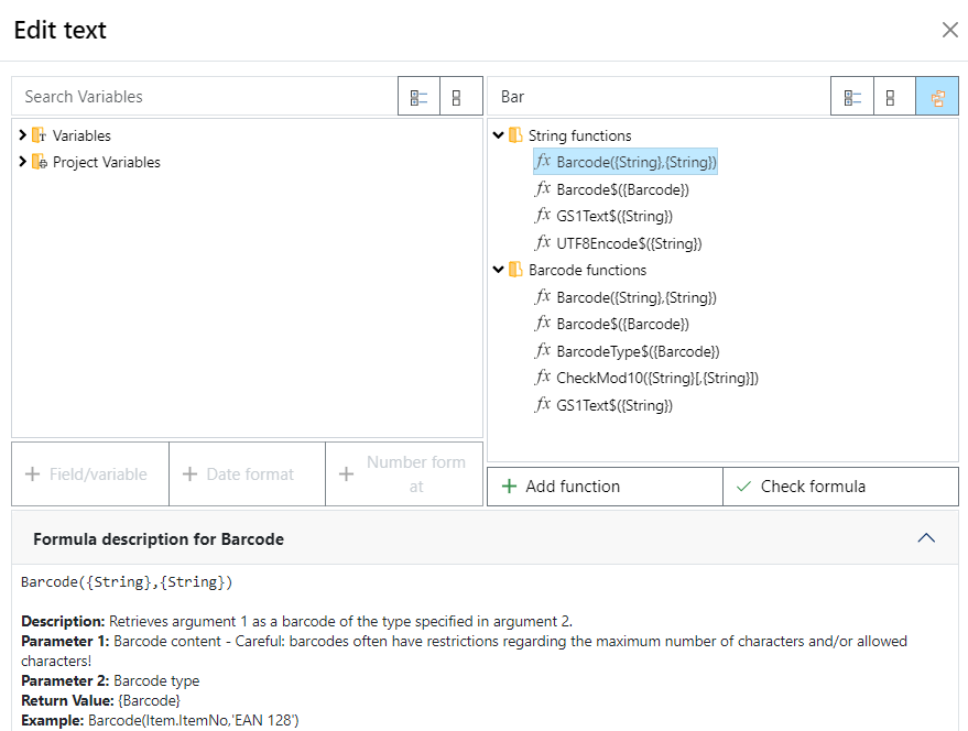 You will find an overview of the available functions on the "Data and Functions" tab. You will also see an explanation of the currently selected function. The explanation informs you of the nature of the function and the type of the arguments that it expects (parameters).