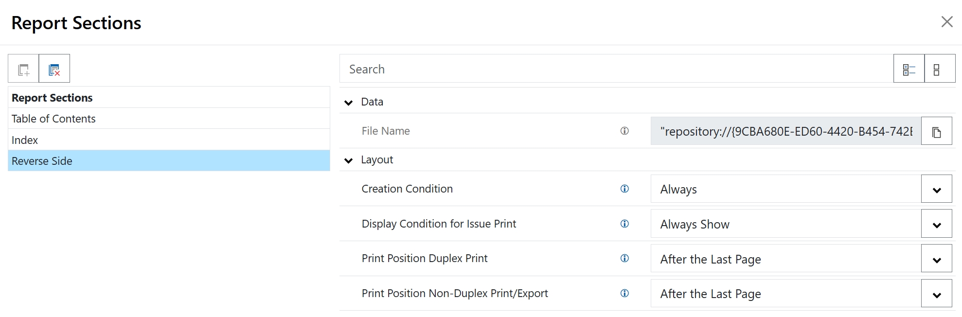 Report Sections can be used to define a reverse side for printing. The corresponding values will be evaluated at print time and the file will be output on every reverse side or only on the first or after the last page.
